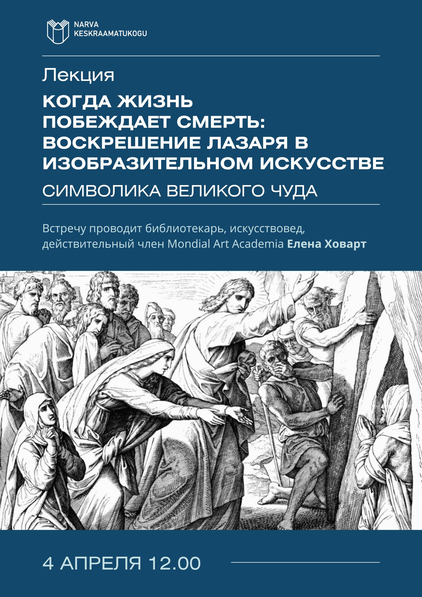 4 апреля, в субботу, в 12.00, в Нарвской центральной библиотеке состоится публичная лекция «Когда жизнь побеждает смерть: воскрешение Лазаря в изобразительном искусстве» Символика великого чуда.