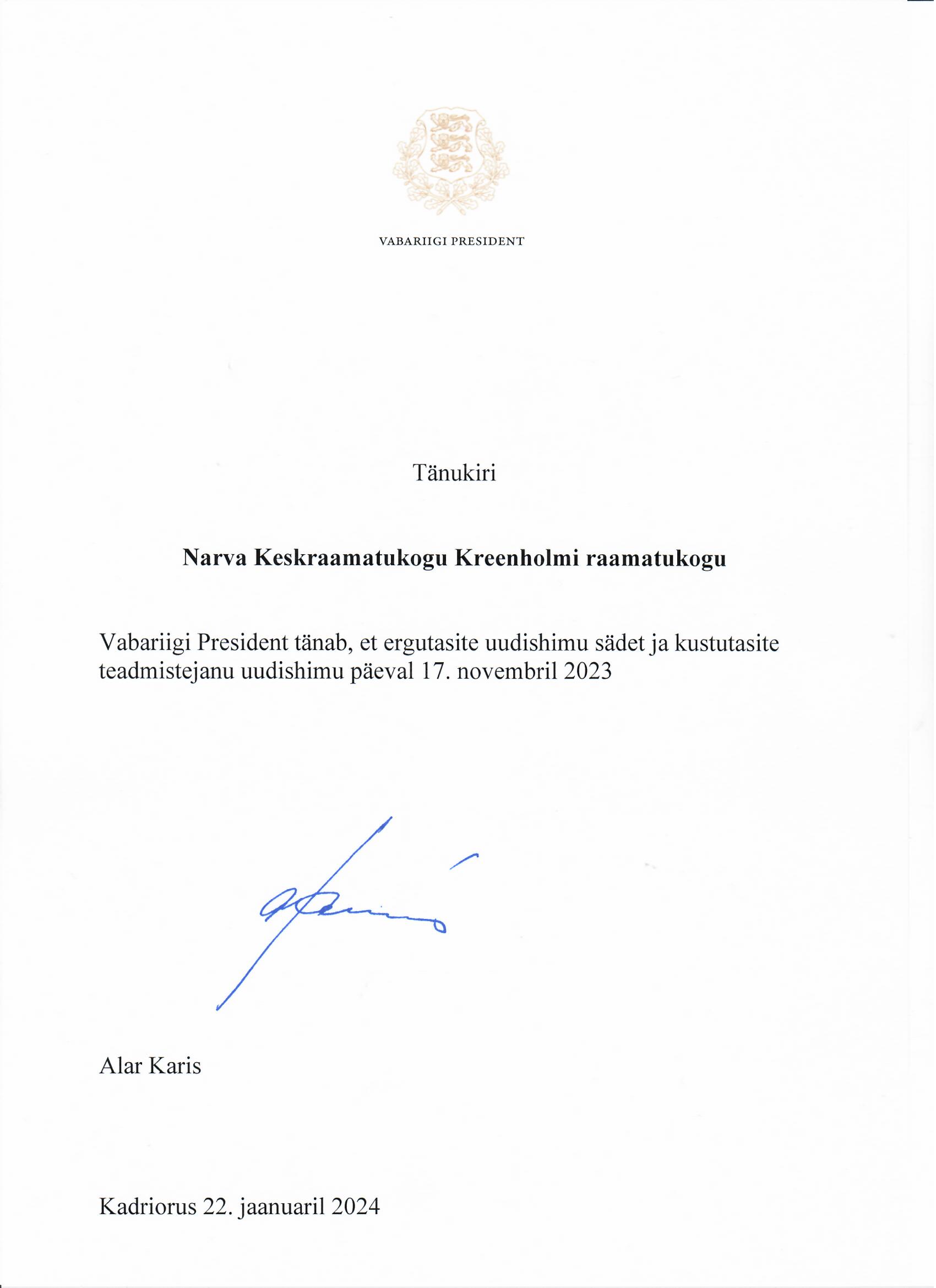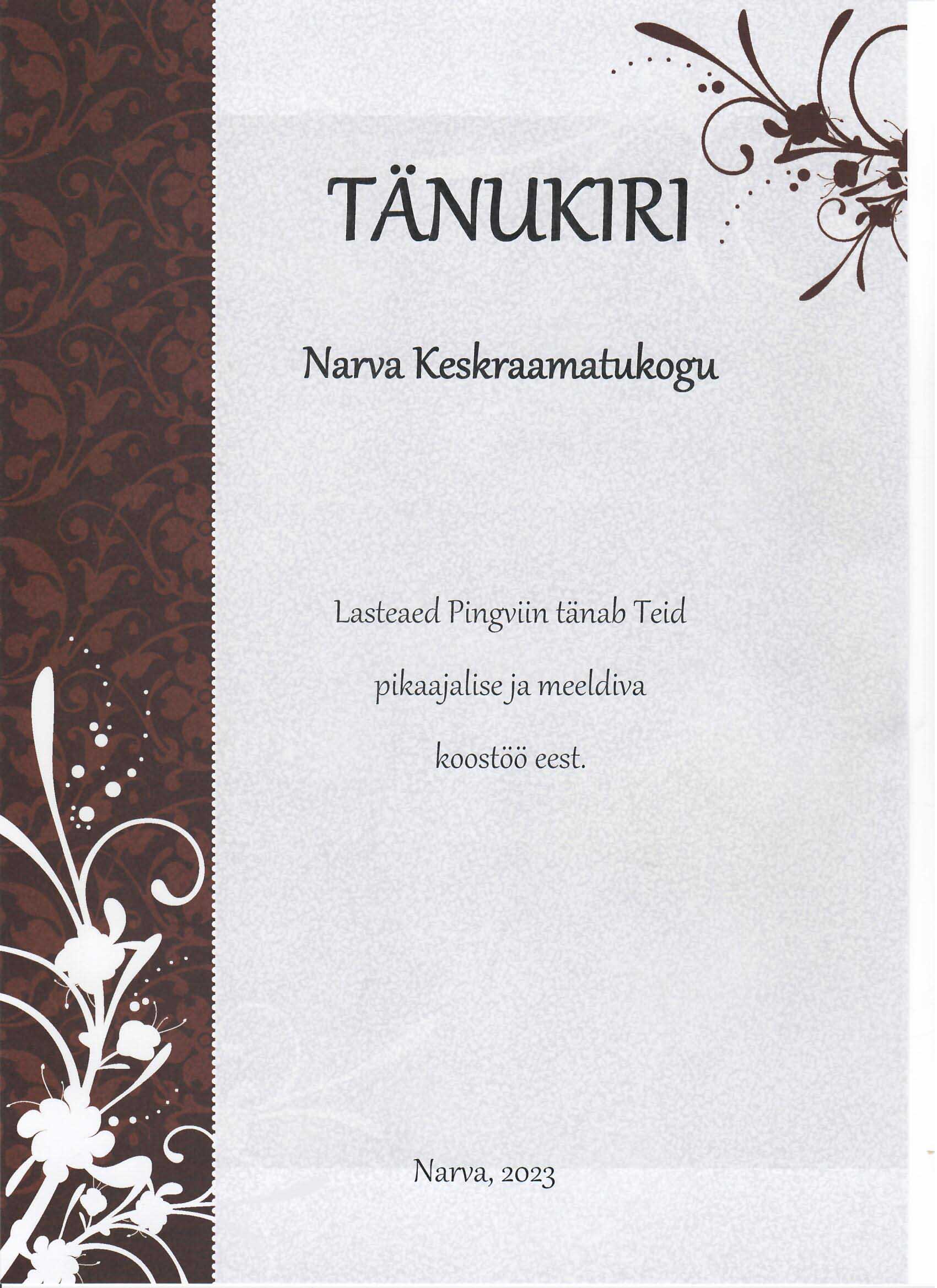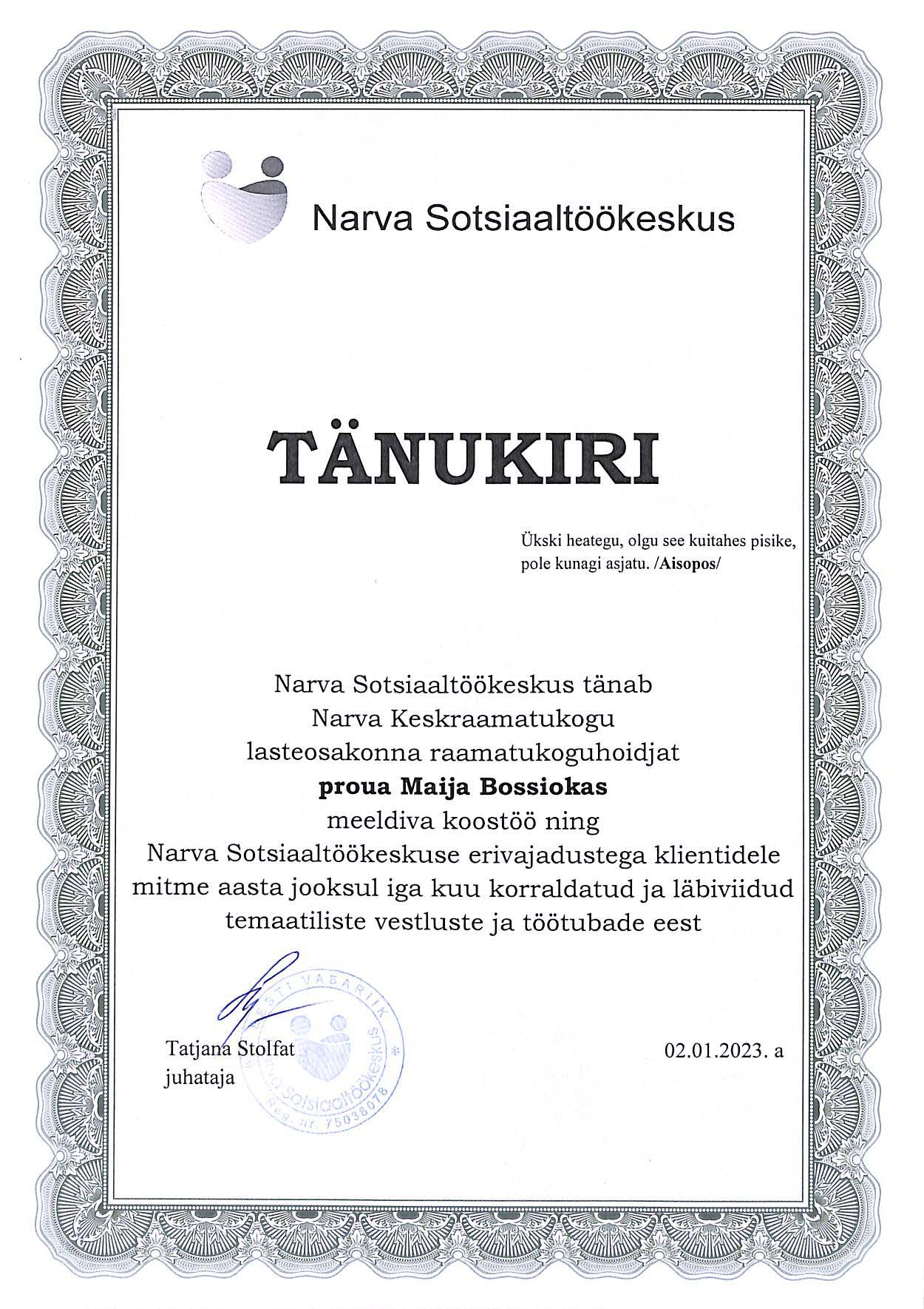Narva Sotsiaaltöökeskus tänab Narva Keskraamatukogu lasteosakonna raamatukoguhoidjat proua Maija Bossioskas meeldiva koostöö ning Narva Sotsiaaltöökeskuse erivajadustega klientidele mitme aasta jooksul iga kuu korraldatud ja läbiviidud temaatiliste vestluste ja töötubade eest (Tatjana Stolfat, Narva Sotsiaaltöökeskuse juhataja, 02.01.2023)