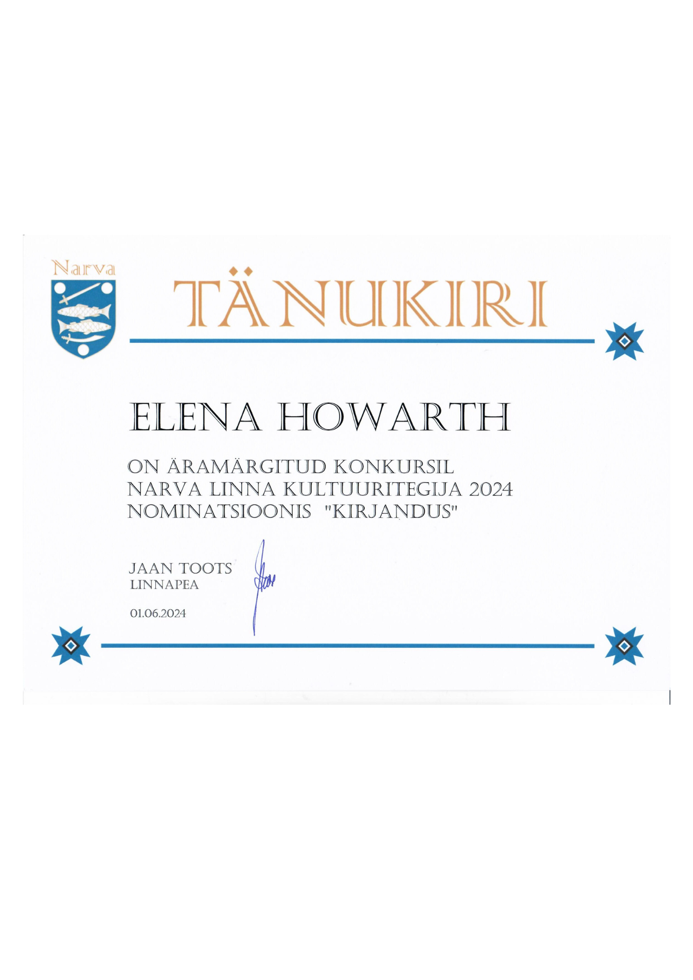 Elena Howarth on äramärgitud konkursil Narva linna kultuuritegija 2024 nominatsioonis „Kirjandus“. (Jaan Toots, linnapea, 01.06.2024) |