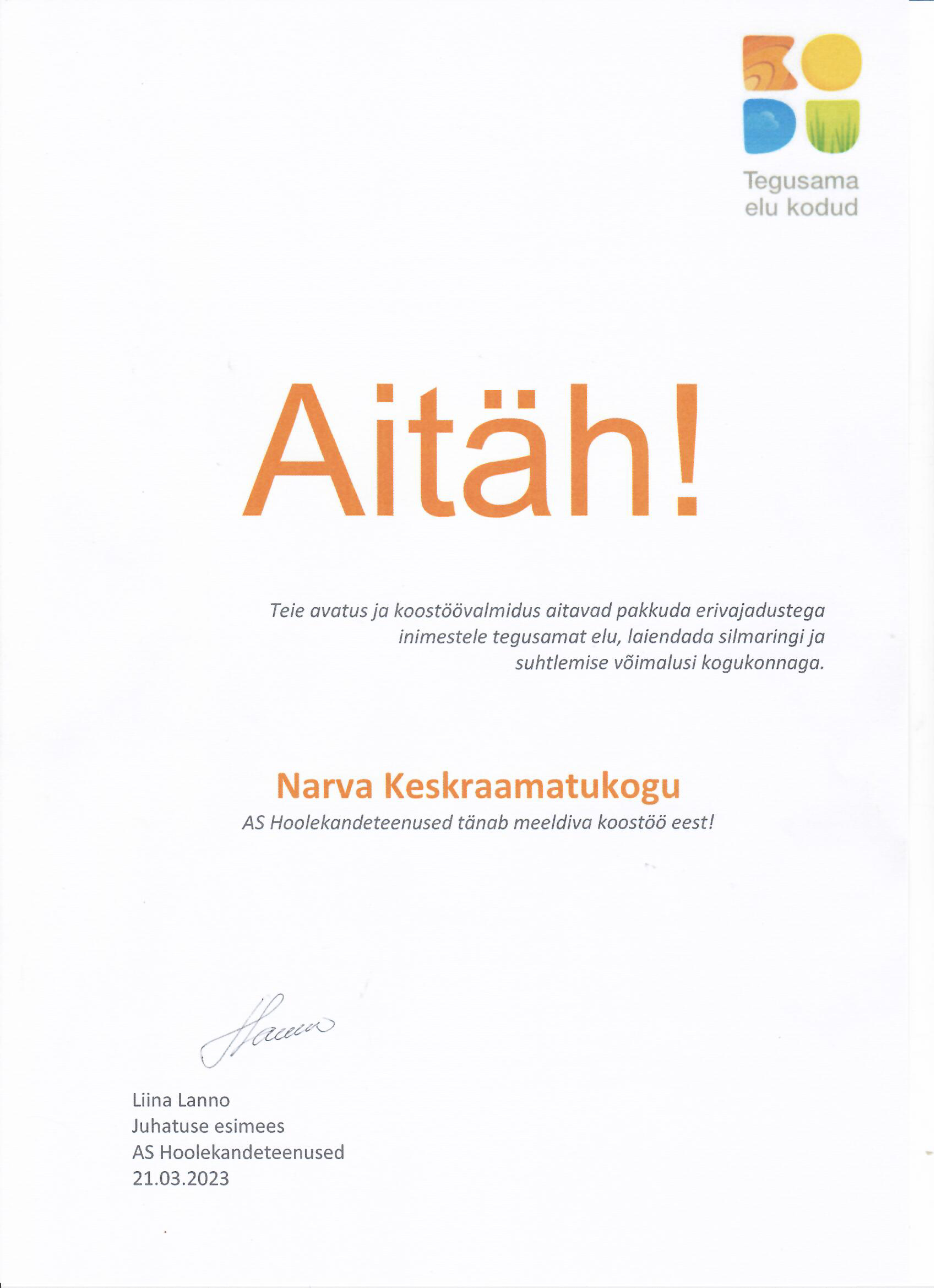 Narva Keskraamatukogu, AS Hoolekandeteenused tänab meeldiva koostöö eest! (Liina Lanno, AS Hoolekandeteenused juhatuse esimees, 21.03.2023)