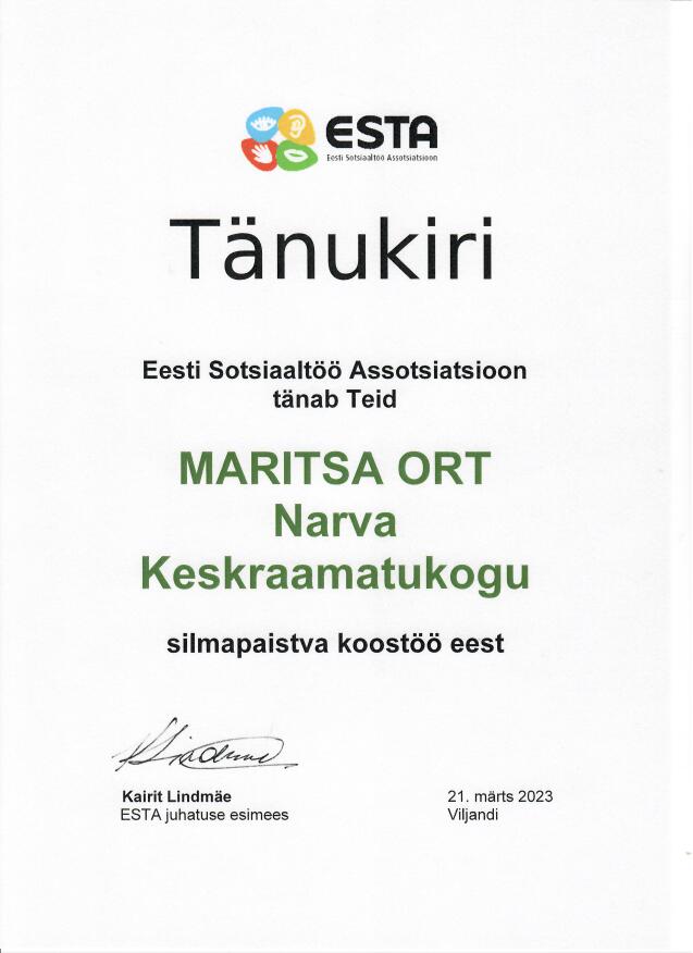 Eesti Sotsiaaltöö Assotsiatsioon tänab Teid Maritsa Ort Narva Keskraamatukogu silmapaistva koostöö eest (Kairit Lindmäe, ESTA juhatuse esimees, 21.03.2023)