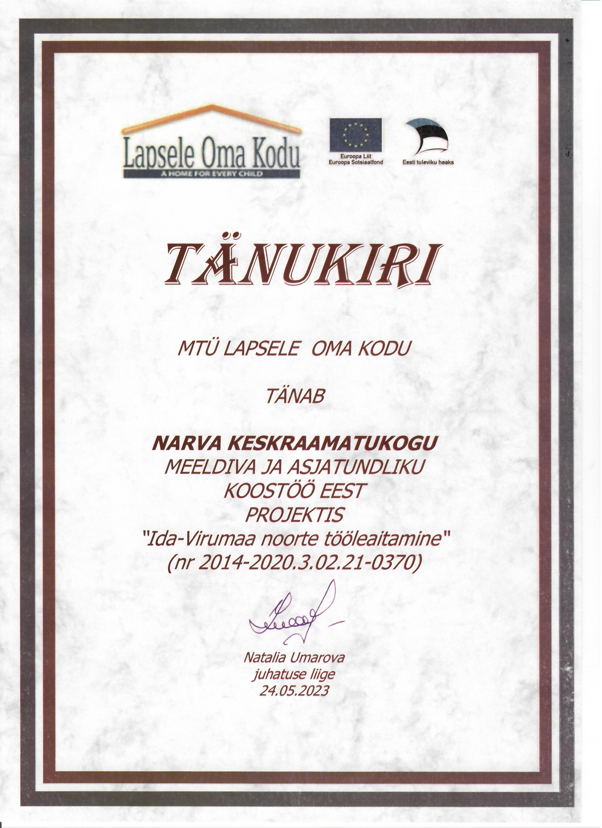 MTÜ Lapsele Oma Kodu tänab Narva Keskraamatukogu meeldiva ja asjatundliku koostöö eest projektis „Ida-Virumaa noorte tööleaitamine“ (nr 2014-2020.3.02.21-0370) (Natalia Umarova, MTÜ Lapsele Oma Kodu juhatuse liige, 24.05.2023) |
