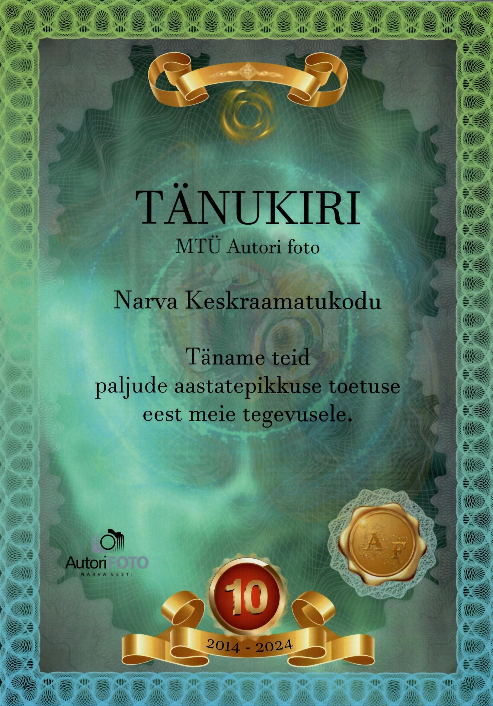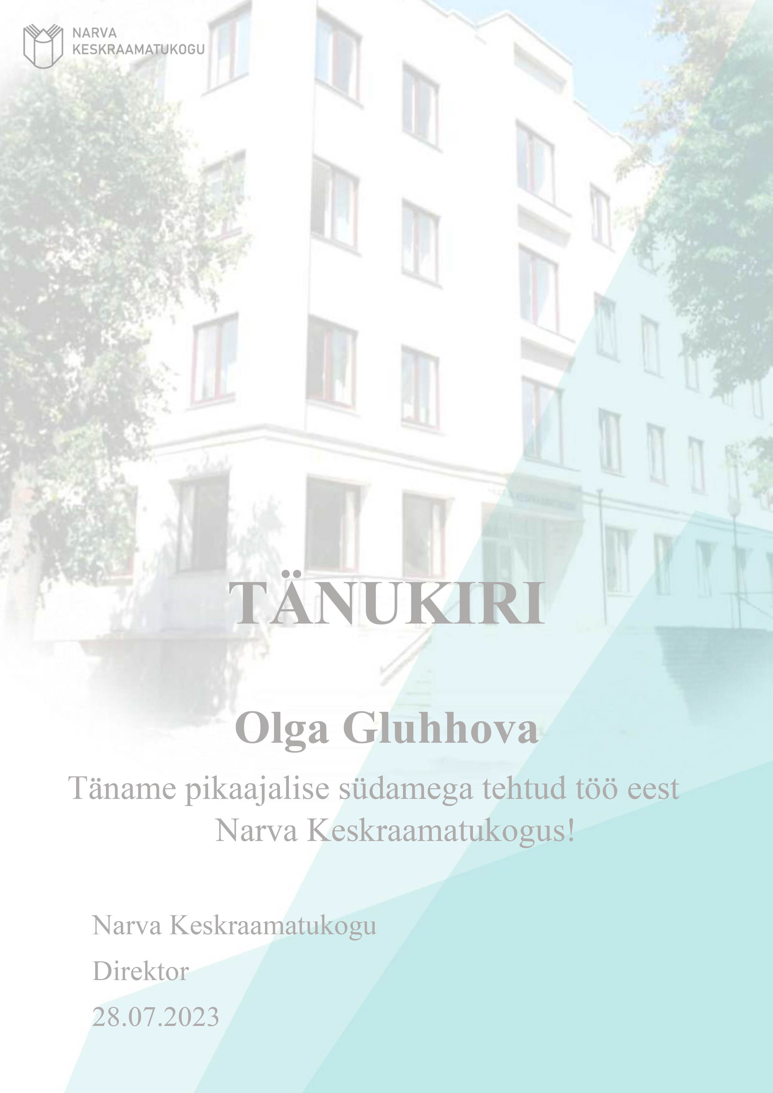 Täname pikaajalise südamega tehtud töö eest Narva Keskraamatukogus! (Narva Keskraamatukogu direktor, 28.07.2023) |
