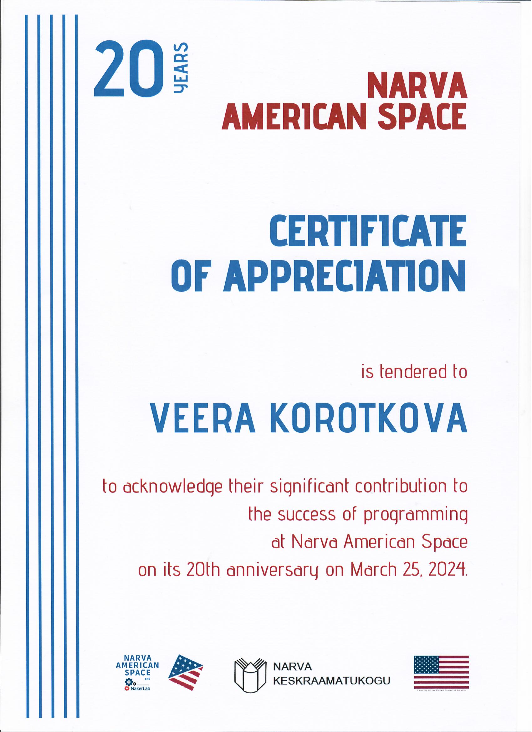 Certificate of appreciation is tendered to Veera Korotkova to acknowledge their significant contribution to the success of programming at Narva American Space on its 20th anniversary on March 25, 2024 |