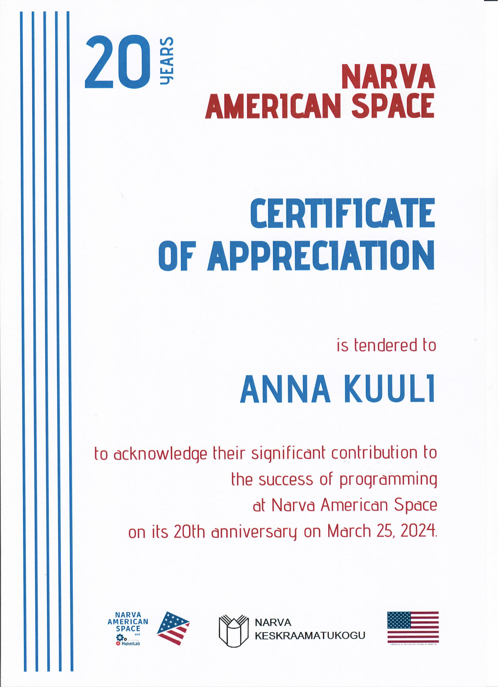 Certificate of appreciation is tendered to Anna Kuuli to acknowledge their significant contribution to the success of programming at Narva American Space on its 20th anniversary on March 25, 2024. |