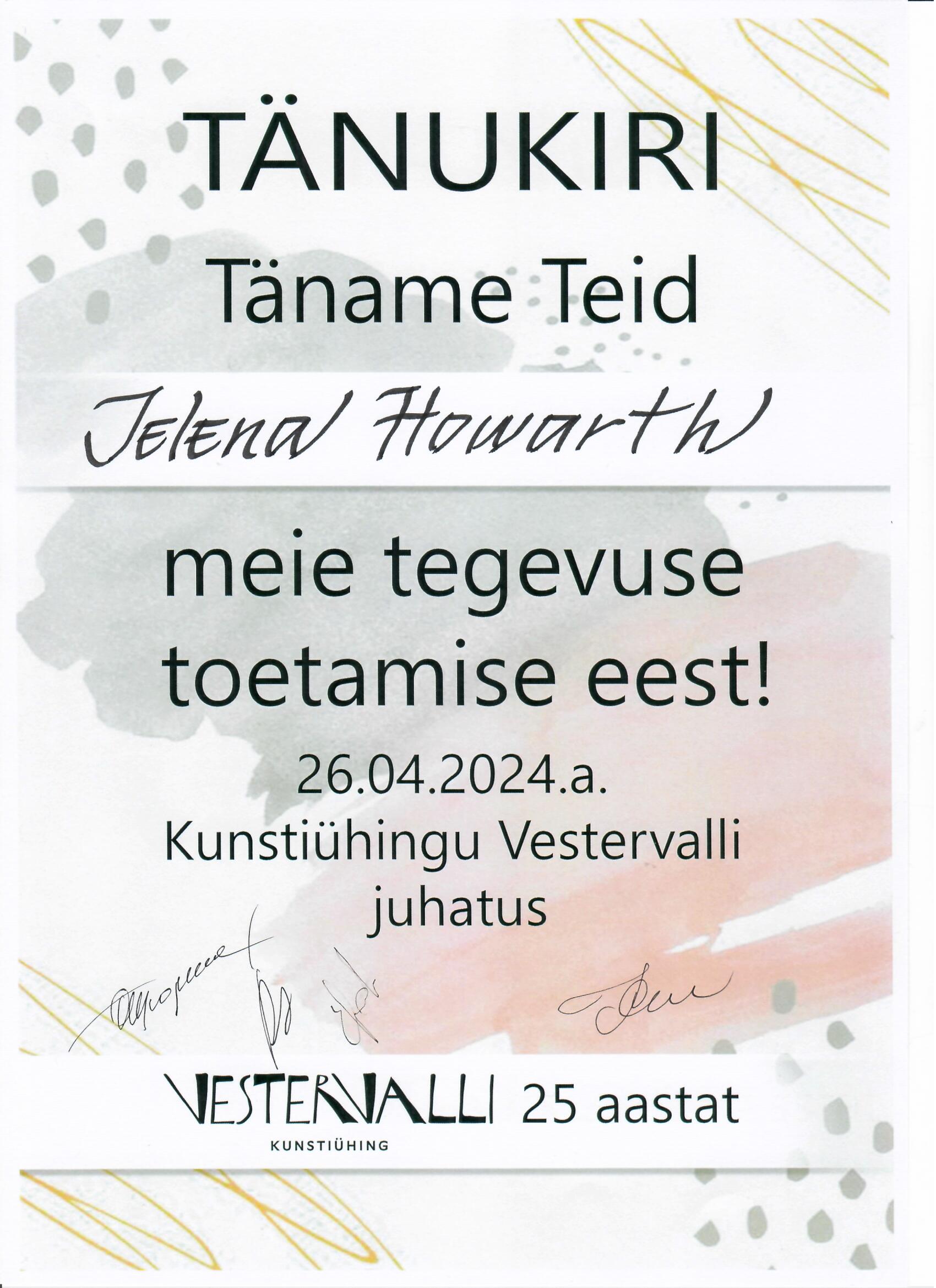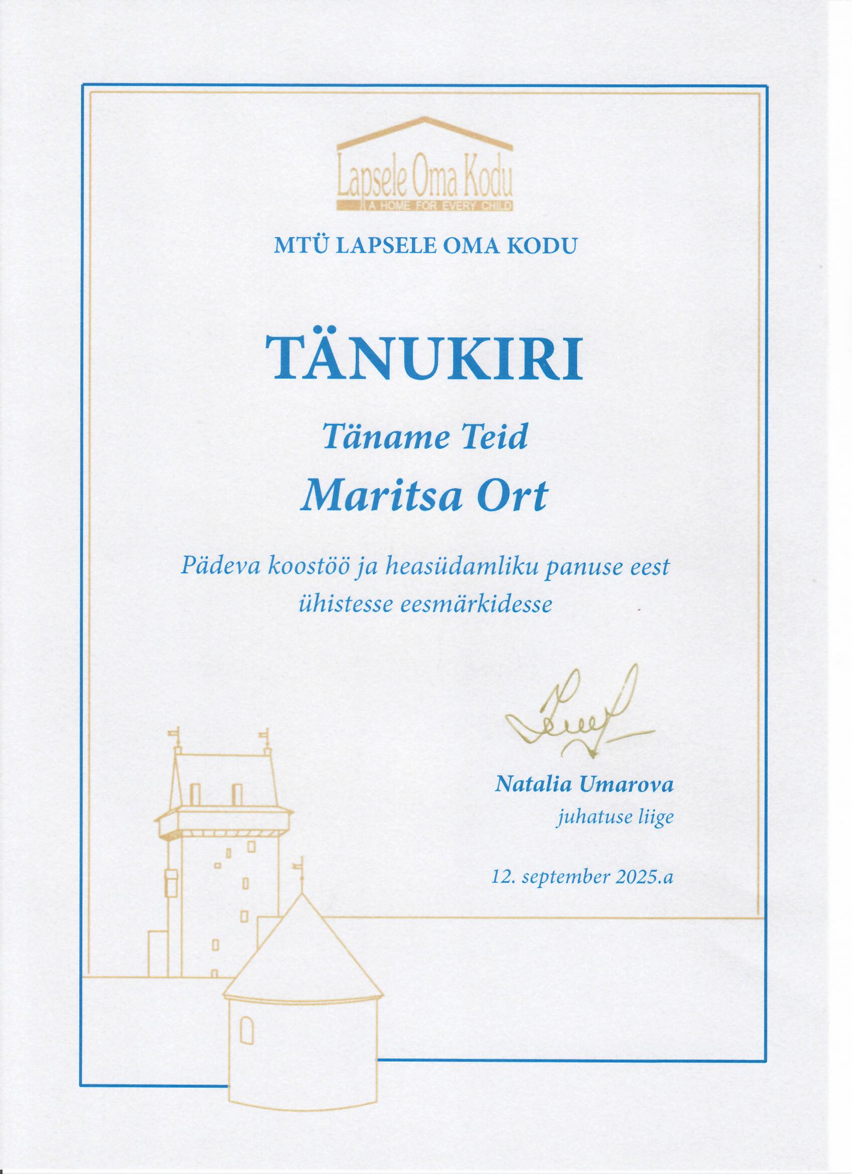Täname Teid Maritsa Ort pädeva koostöö ja heasüdamliku panuse eest ühistesse eesmärkidesse (Natalia Umarova, MTÜ Lapsele Oma Kodu juhatuse liige, 12.09.2025) |