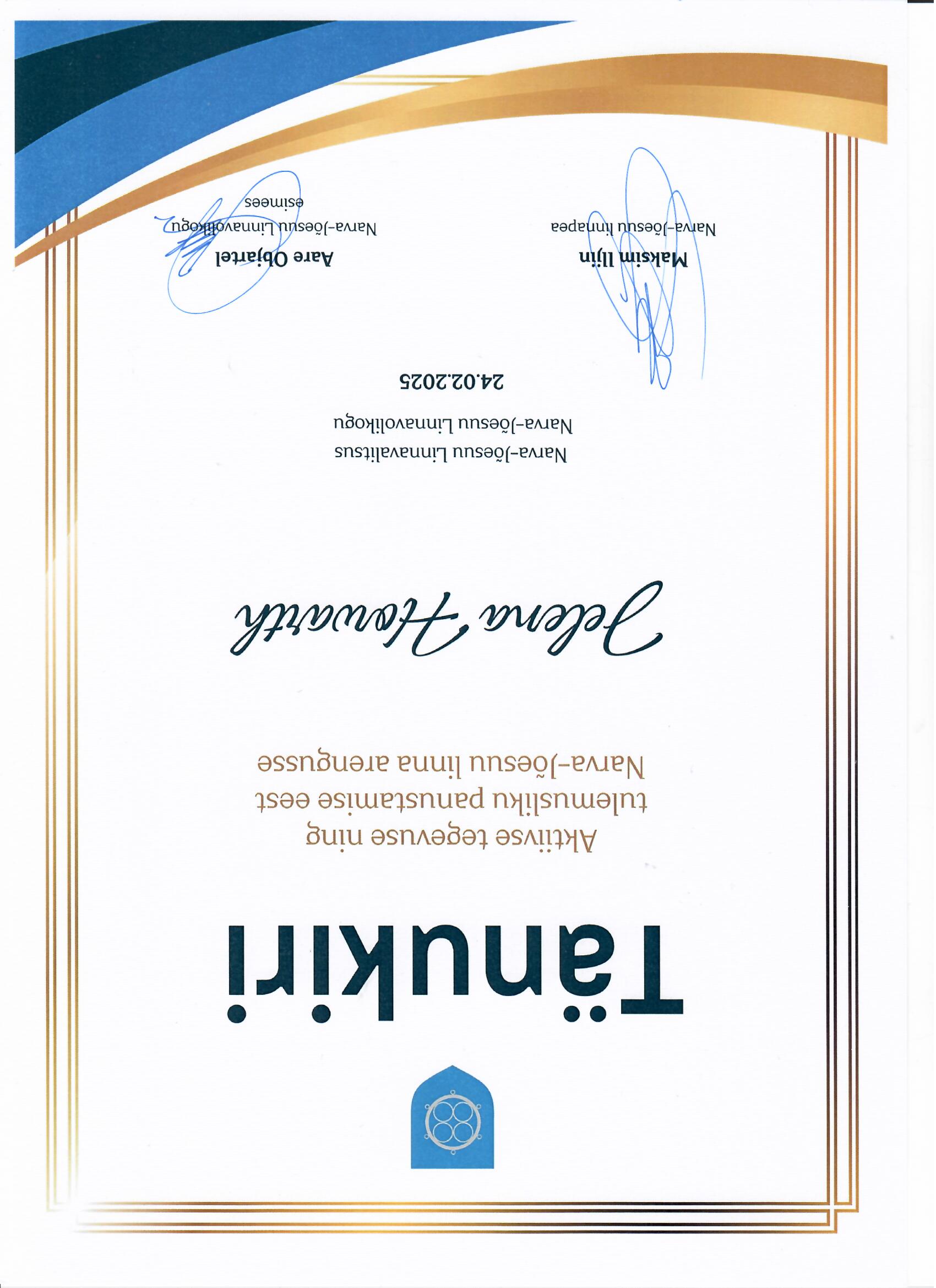 Aktiivse tegevuse ning tulemusliku panustamise eest Narva-Jõesuu linna arengusse (Maksim Iljin, Narva-Jõesuu linnapea, Aare Objartel, Narva-Jõesuu Linnavolikogu esimees, 24.02.2025)
