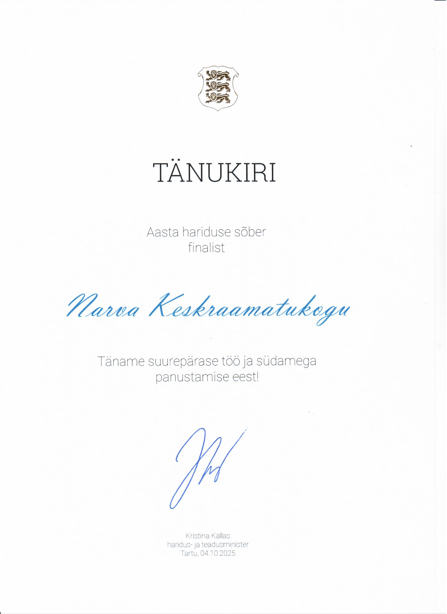 Aasta hariduse sõber finalist Narva Keskraamatukogu.