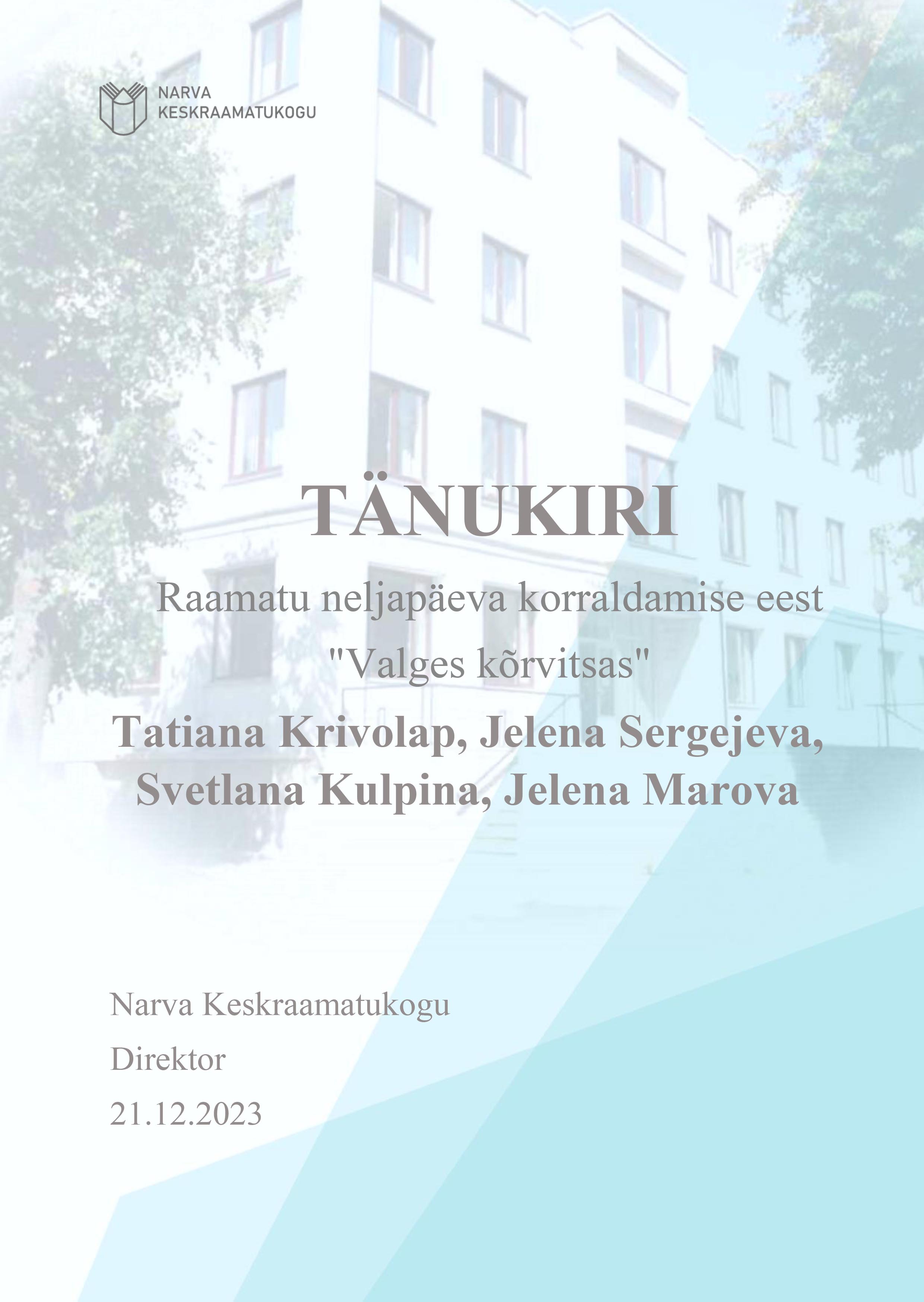 Raamatu neljapäeva korraldamise eest „Valges kõrvitsas“ (Narva Keskraamatukogu direktor, 21.12.2023)