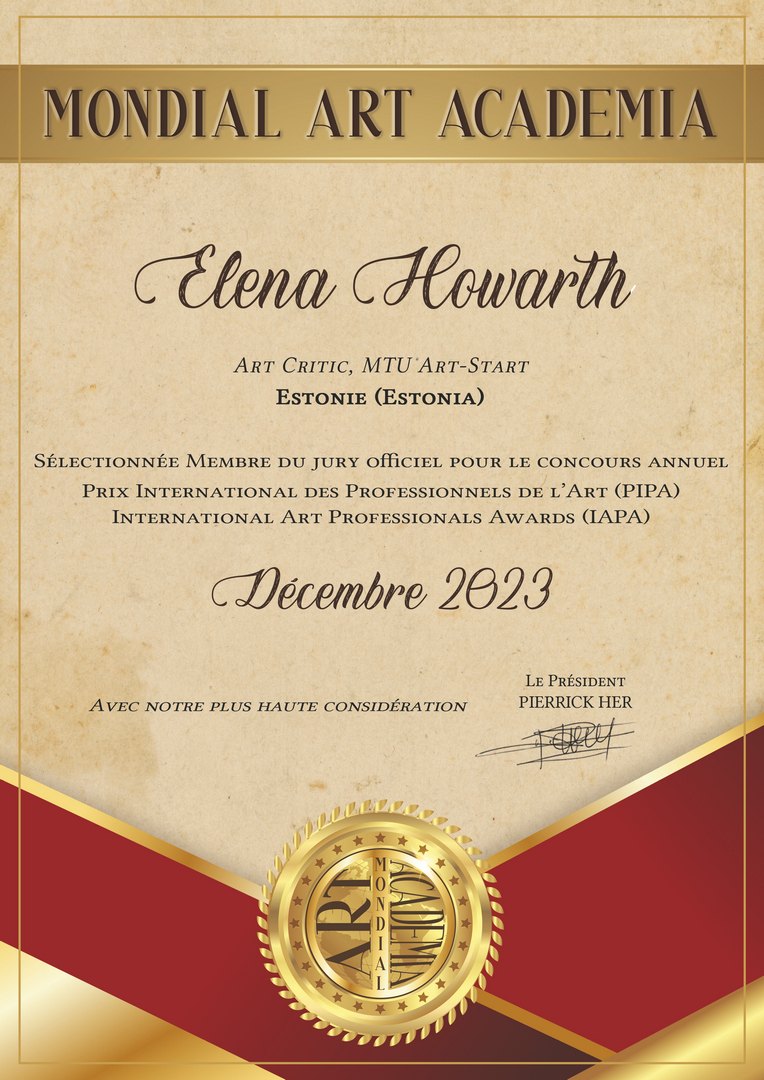 Sélectionnée Membre du jury officiel pour le concours annuel Prix International des Professionnels de l’Art (PIPA) (Pierrick Her, le Président de MONDIAL ART ACADEMIA, 2023)