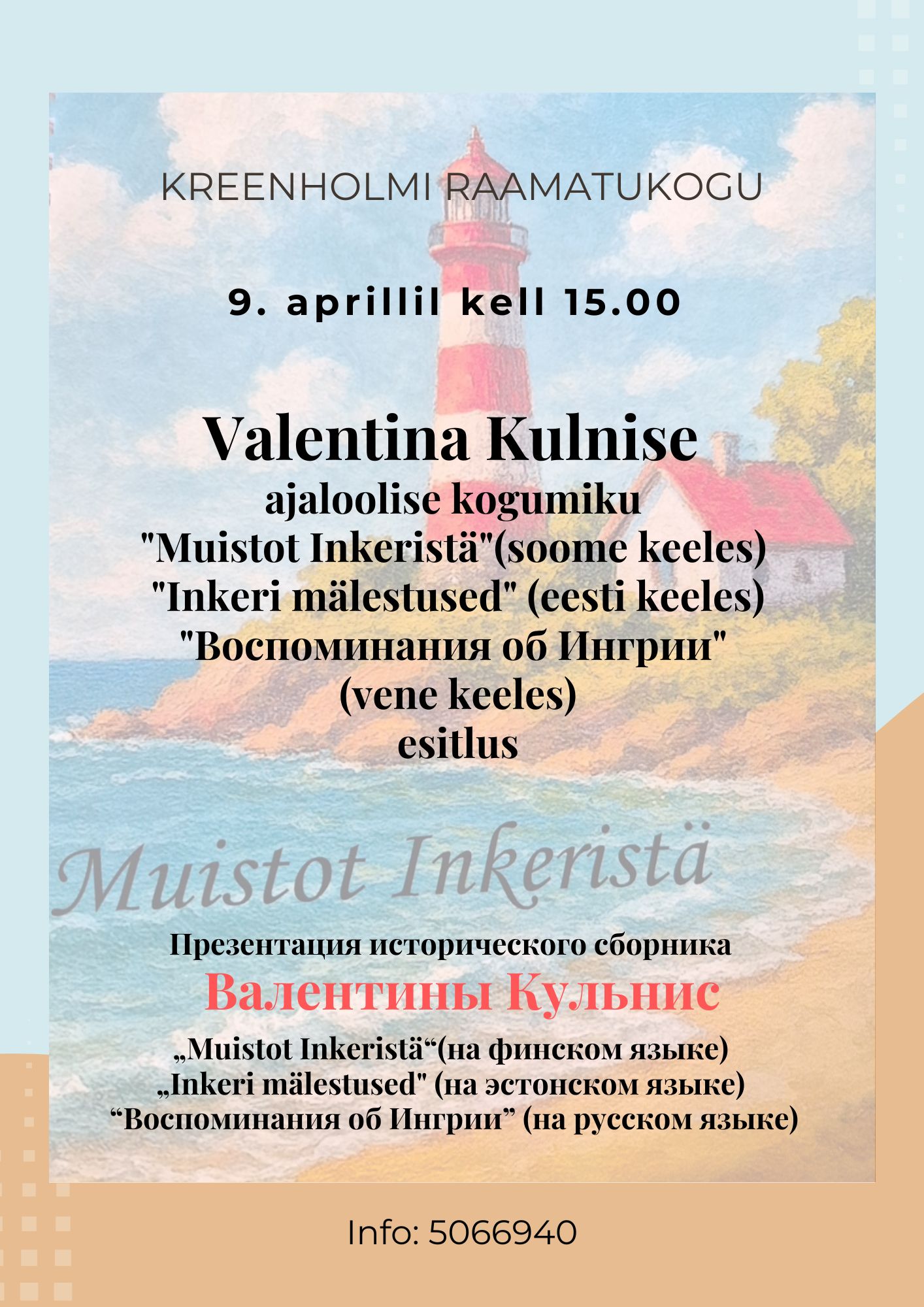 9. aprillil kell 15.00 toimub Kreenholmi raamatukogus Valentina Kulnise raamatu esitlus "Muistot Inkeristä"(soome keeles) "Inkeri mälestused" (eesti keeles) "Воспоминания об Ингрии" (vene keeles).