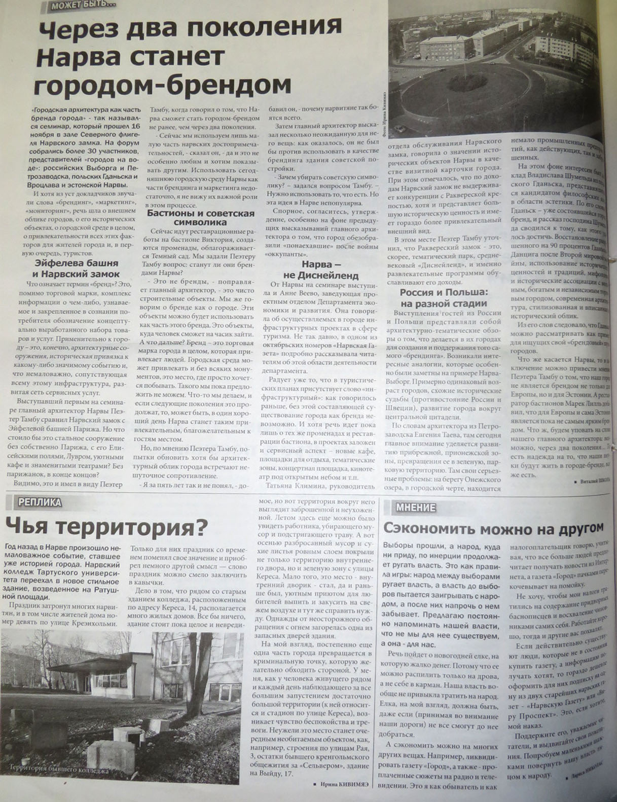 Школа, В. Через два поколения Нарва станет городом-брендом: [семинар "Городская архитектура как часть бренда"]