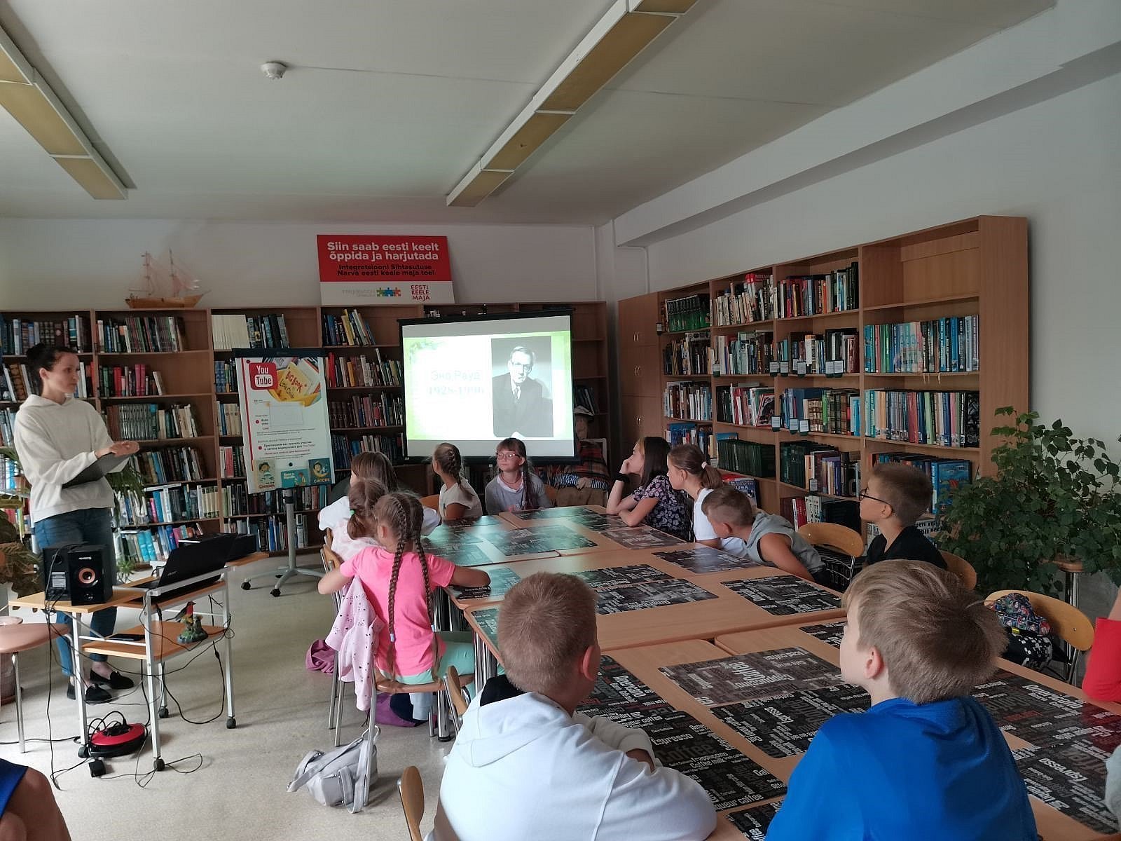 Linnalaagri lapsed on raamatukogus külas. Sipsik on armas raamatu peategelane.